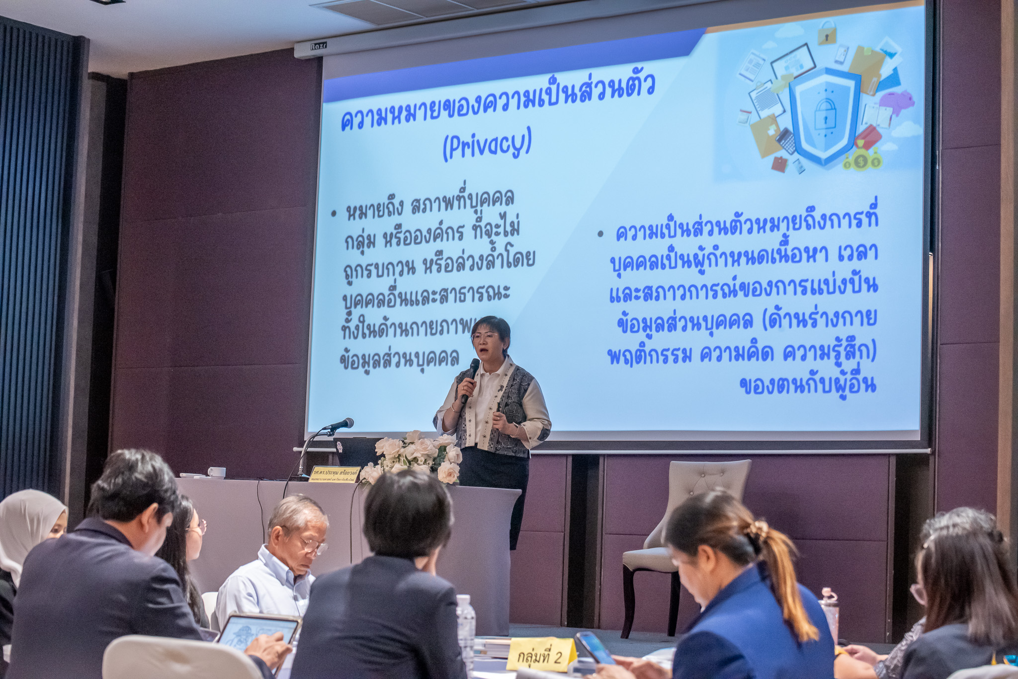 ช่วงบ่ายการอบรมมีการเปลี่ยนรูปแบบโดยให้ผู้เข้าร่วมแบ่งเป็นกลุ่มจำนวน 5 กลุ่ม กับหัวข้อการบรรยายเรื่อง หัวข้อ "ความเสี่ยงจากการละเมิดความเป็นส่วนตัวและการฝ่าฝืนการรักษาความลับ" โดยในมิติของจริยธรรมวิจัย รศ.ดร.ประทุม สร้อยวงค์ ชี้ให้เห็นว่า "ความเป็นส่วนตัว" (Privacy) และ "การรักษาความลับ" (Confidentiality) เป็นหัวใจสำคัญที่ต้องทำงานควบคู่กัน ความเป็นส่วนตัวคือสิทธิที่บุคคลจะกำหนดได้เองว่า จะแบ่งปันข้อมูล "อะไร เมื่อไหร่ และอย่างไร" ขณะที่การรักษาความลับคือพันธะที่นักวิจัยต้องปกป้องข้อมูลไม่ให้รั่วไหลสู่ผู้ไม่มีอำนาจหน้าที่ ท่านเตือนให้ระวังพฤติกรรม "Cold calling" หรือการเข้าถึงข้อมูลเวชระเบียนแล้วโทรหาอาสาสมัครโดยตรงโดยไม่ได้แจ้งล่วงหน้า ซึ่งถือเป็นการลุกล้ำความเป็นส่วนตัวอย่างรุนแรง โดยผลกระทบจากการละเมิดนั้นร้ายแรงเกินกว่าความรำคาญใจ แต่รวมถึงความเสี่ยงทางจิตใจและสังคม เช่น การถูกตีตรา (Stigma), การถูกแบ่งแยก, หรือแม้แต่ความเสี่ยงทางเศรษฐกิจและกฎหมาย เช่น การสูญเสียงานหรือถูกดำเนินคดีหากข้อมูลสุขภาพหรือพฤติกรรมที่ละเอียดอ่อนรั่วไหล ภายใต้เงาของกฎหมาย PDPA ที่มีโทษปรับทางปกครองสูงถึง 5 ล้านบาท