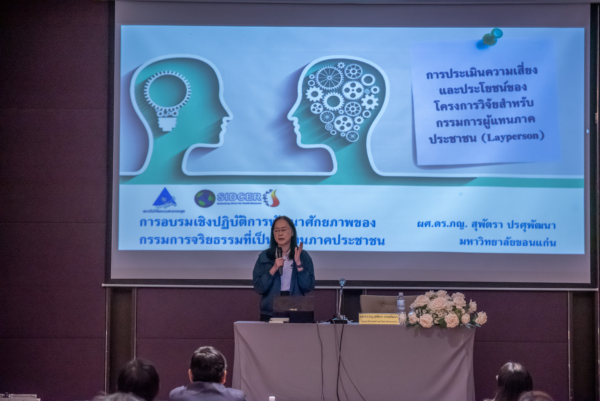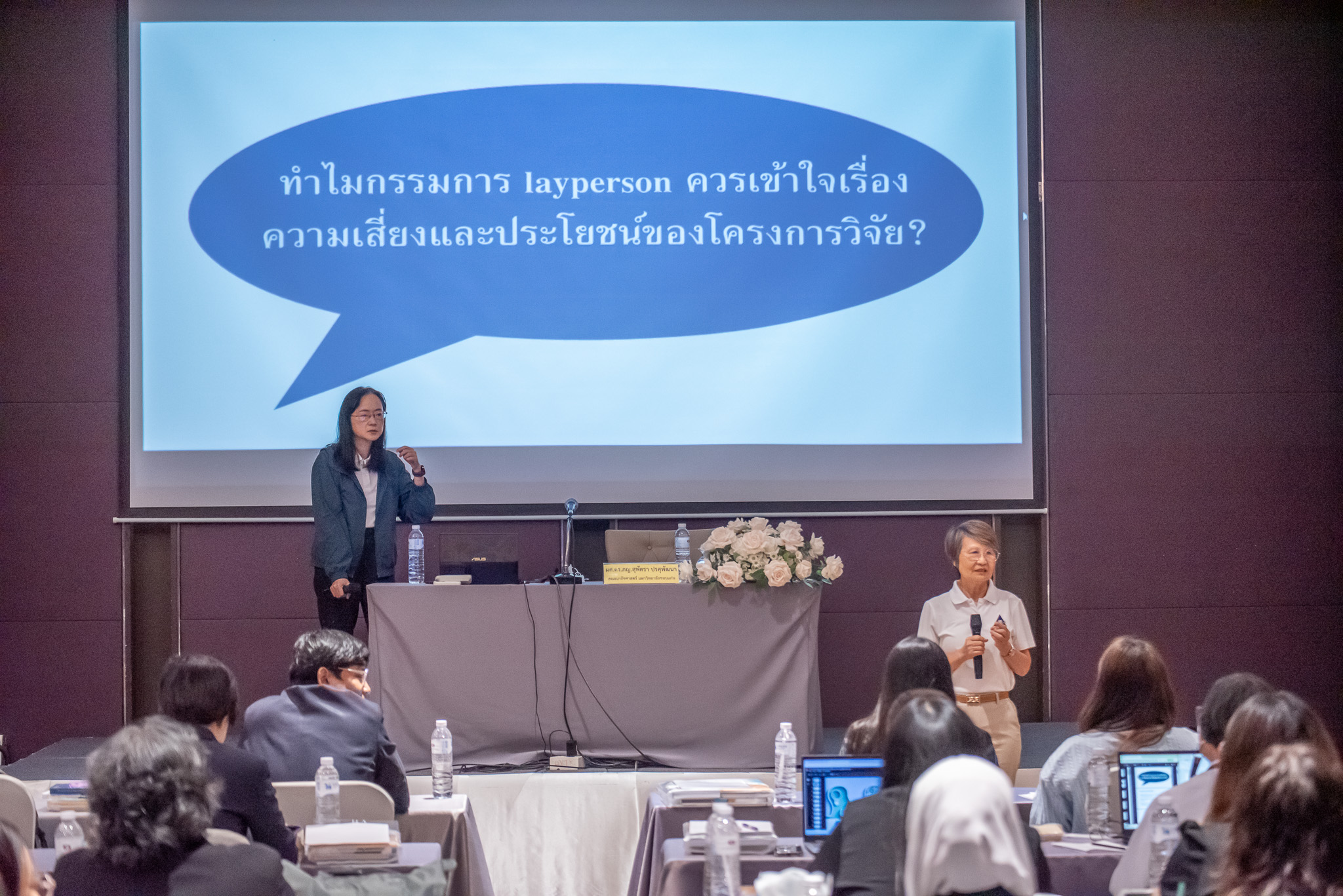 ต่อมา ผศ.ดร.ภญ.สุพัตรา ปรศุพัฒนา รับไม้ต่อกับการบรรยายหัวข้อ "การประเมินคุณประโยชน์และความเสี่ยง" ได้ขยายความนิยามและหลักการประเมินความเสี่ยงและผลประโยชน์ (Risk/Benefit Assessment) เพื่อให้กรรมการภาคประชาชน (Layperson) เข้าใจถึง "ปราการด่านสุดท้าย" ในการปกป้องอาสาสมัคร เช่น